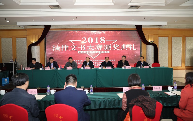 11月22日,由省法学研究生教育指导委员会主办、beat365官网beat365在线唯一官网和研究生学院承办的2018年河北省法学研究生法律文书写作大赛颁奖典礼在石家庄举行。省政府学位办副主任季家林,省高级人民法院刑四庭高级法官熊学军,省法学研究生教指委主任委员柴振国,省法学研究生教指委委员、石家庄铁道大学人文学院院长王宏斌,beat365官网研究生学院党委书记刘春霖,河北地质大学法政学院党委书记马沁芳,燕山大学文beat365在线唯一官网法律系主任陈海平,中国人民警察大学法律教研室主任刘红岩,石家庄铁道大学人文学院法律系副主任王晓云出席典礼。仪式由河北省法学研究生教指委秘书长、beat365官网beat365在线唯一官网院长王利军主持。