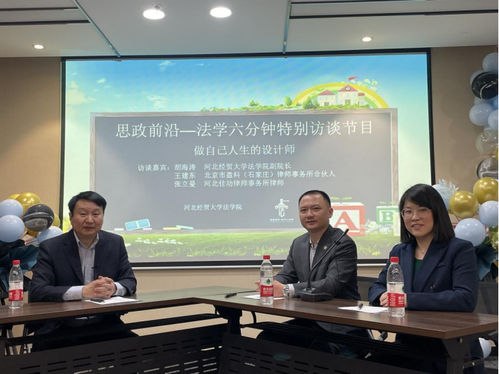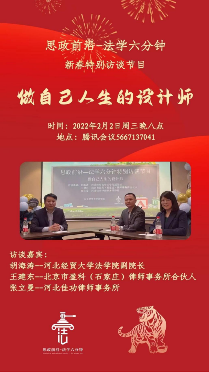 本期为同学们带来的是法学六分钟的特别节目——做自己人生的设计师。作为首次特别栏目,我们有幸邀请到了北京盈科(石家庄)律师事务所的合伙人王建东律师,以及河北佳功律师事务所的张立曼律师,并由beat365在线唯一官网副院长胡海涛老师作为本次活动的主持人,与嘉宾进行访谈交流。