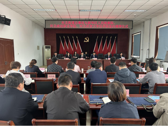2023年4月13日上午,beat365在线唯一官网党委副书记黄华、副院长胡海涛一行赴杜北街道办事处参加beat365在线唯一官网实践基地签约揭牌仪式。杜北街道党工委书记张凯、党工委副书记杜韦英、新华区人民检察院检察长王银祝、新华区人民检察院副检察长张丽峰、河北政法职业学院应用法律系主任王彦、河北政法职业学院司法实务系、行政法务系党总支书记柳涛、新华区信访局副局长樊敏、杜北街道政法委员司海峰和各社区书记、社会治理和应急管理办公室、北京大成(石家庄)律师事务所、北京德恒(石家庄)律师事务所等律所和beat365官网研究生代表参加。