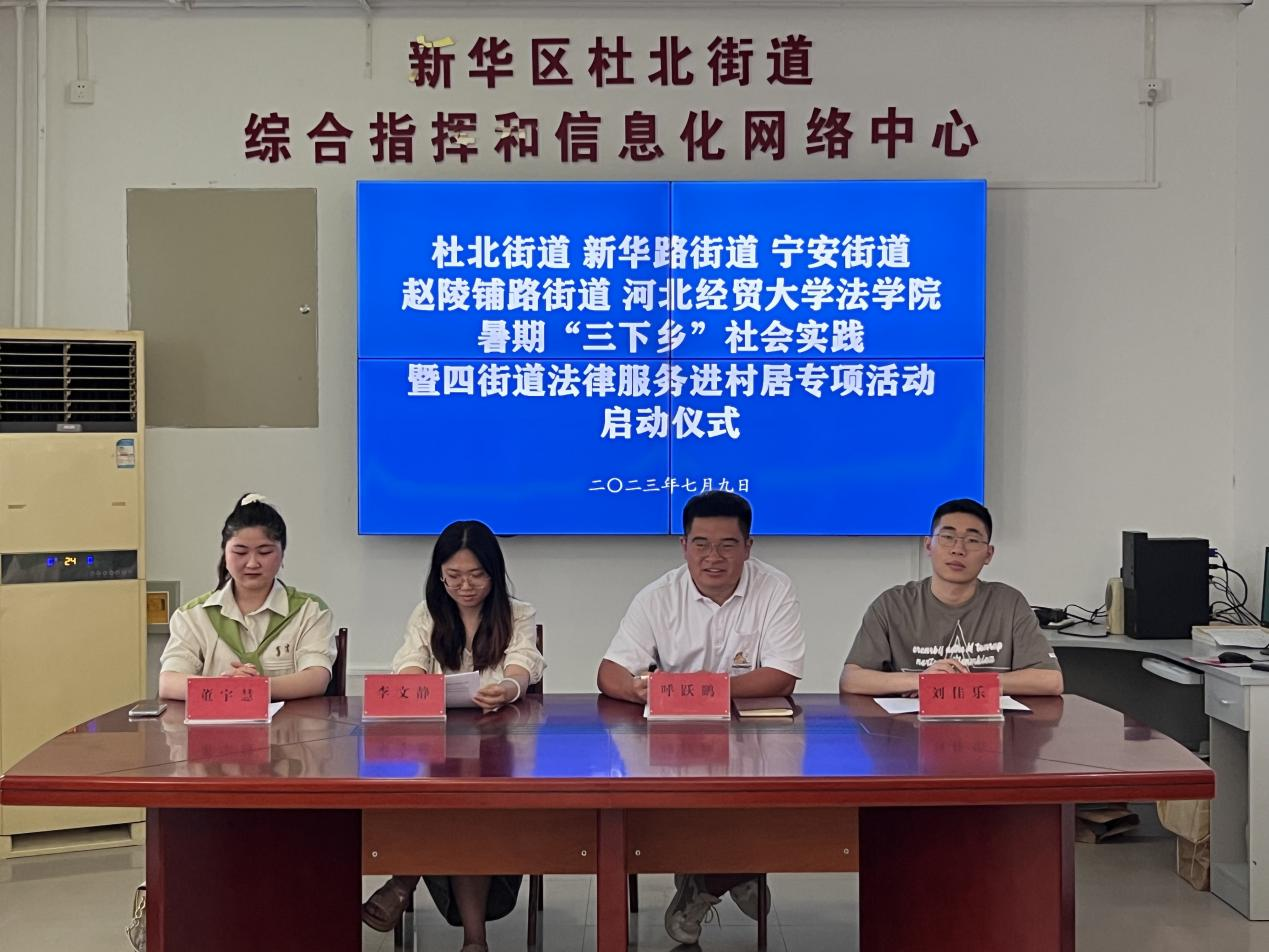 7月9日上午,beat365在线唯一官网联合杜北街道、新华路街道、宁安街道、赵陵铺路街道于杜北街道公共法律服务中心联合举办暑期“三下乡”社会实践暨四街道法律服务进村居专项活动启动仪式,杜北司法所工作人员呼跃鹏主持仪式,新华路司法所、宁安司法所、赵陵铺路司法所工作人员及beat365在线唯一官网“枫桥”暑期“三下乡”社会实践团全体成员参加仪式。