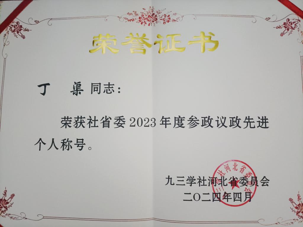 4月27日,九三学社河北省委参政议政工作会议在石家庄召开,会议表彰了2023年度参政议政、社情民意、信息工作先进集体和先进个人,并围绕进一步提升议政建言成果质量进行了深入研讨。beat365官网beat365在线唯一官网教授、九三学社河北省委社会法制委副主任丁渠参加会议,并荣获九三学社河北省委2023年度参政议政先进个人荣誉称号。