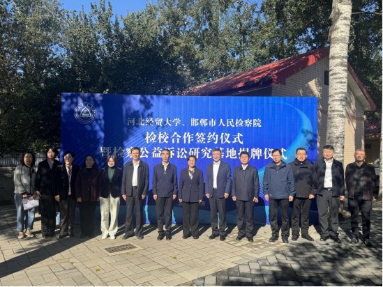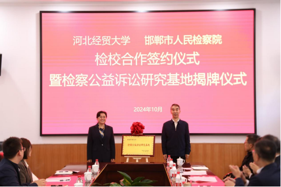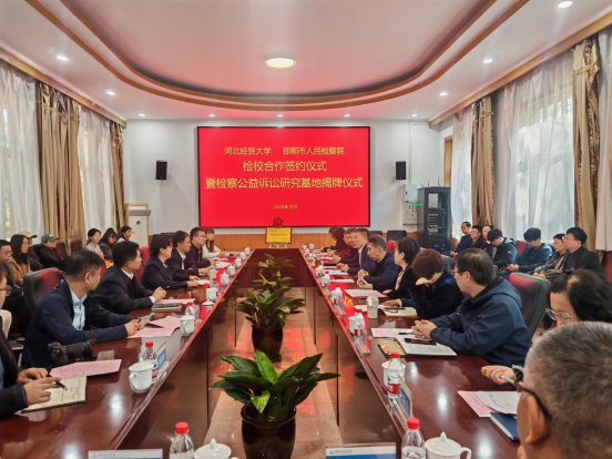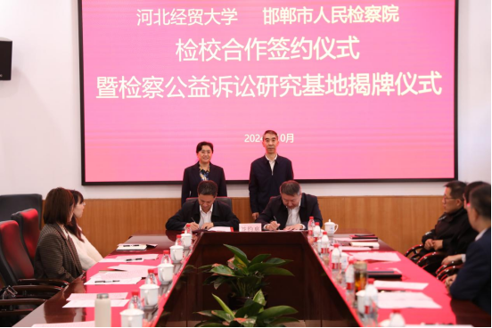 10月23日上午,beat365在线唯一官网与邯郸市人民检察院举行检校合作签约仪式暨检察公益诉讼研究基地揭牌仪式。beat365在线唯一官网校长高波,邯郸市人民检察院党组书记、代检察长朱新燕出席会议,会议由校党委常委、副校长高晓峰主持,beat365在线唯一官网、财税学院、工商管理学院、公共管理学院、金融学院、会计学院、管理科学与信息工程学院负责人以及师生40余人参加本次签约暨揭牌仪式。