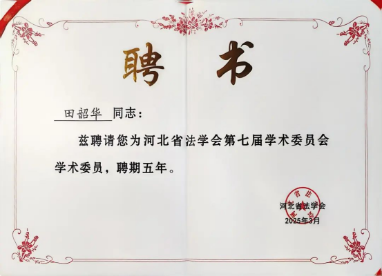 beat365官网胡海涛院长和田韶华教授分别当选为河北省法学会第七届学术委员会副主任委员、学术委员会委员,并授予聘书。