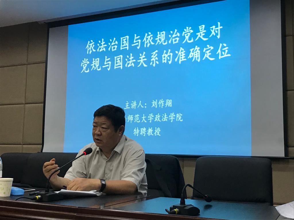 刘作翔教授作了题为“依法治国与依规治党是对党规与国法关系的准确定位”的学术报告。刘作翔教授围绕着“依法治国”与“依规治党”两个方面就“党规”与“国法”的关系作了详细的讲解。他讲述了新时代下党章与党内法规的关系,并指出党内法规是作为法律体系中的法律规范的法理依据。他强调,新修订的《中国共产党党内法规制定条例》(以下简称《条例》)完善了党内法规的定义,更加全面准确地阐明了党内法规的属性、特征和功能。《条例》明确了制定权限,回应实践要求和各方面关切,对授权制定、联合制定、制定配套规定等问题作出明确规定,补齐制度短板。《条例》还完善了党内法规的效力位阶、冲突处理、解释、修改等规定,强化了党内法规制定工作的保障措施。