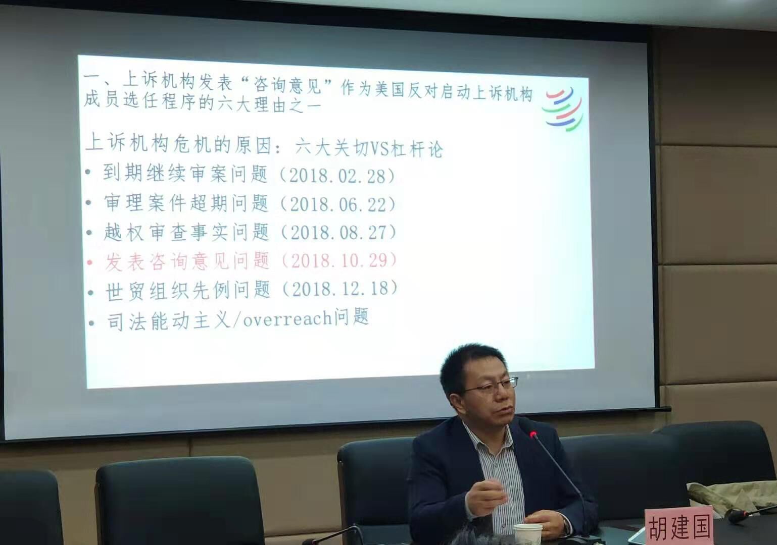 2019年10月26日,南开大学beat365在线唯一官网胡建国教授应邀来beat365在线唯一官网作了题为“WTO上诉机构发表咨询意见‘否定论’”的学术报告,报告地点在模拟法庭三楼会议室。,学院共有60余名研究生参加。
