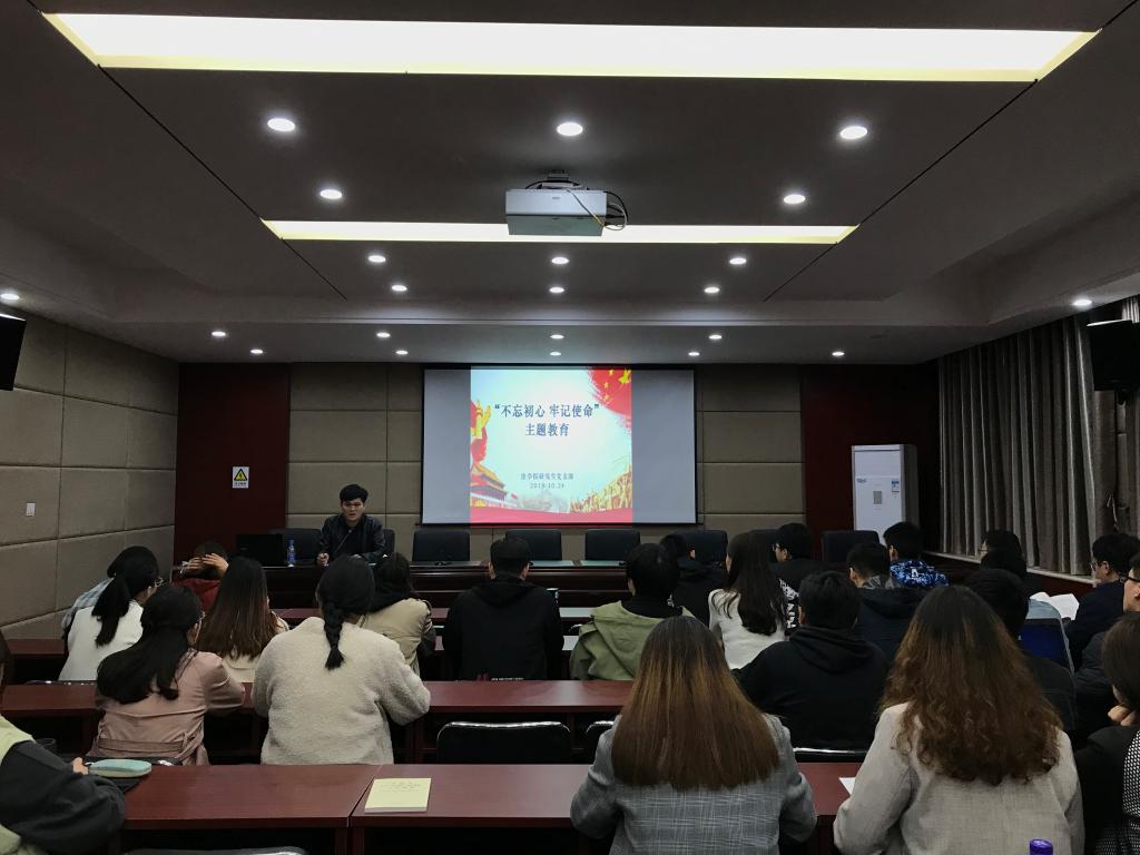 2019年10月24日下午,beat365在线唯一官网研究生党支部于模拟法庭报告厅开展“不忘初心、牢记使命”主题教育,研究生党支部书记陈运涛和支部党员40多人参加。