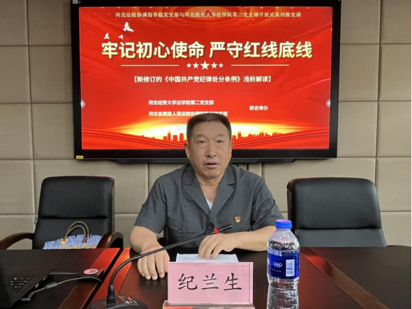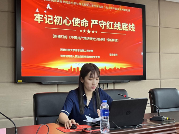 随后,在beat365在线唯一官网模拟法庭,beat365在线唯一官网学生第二党支部与省高院协调指导庭党支部展开“牢记初心使命,严守红线底线”联合主题党课,省高院协调指导庭庭长纪兰生、beat365在线唯一官网学生第二党支部书记解思语分别从实践和理论的角度对新修订的《中国共产党纪律处分条例》进行浅析解读;纪兰生还对学生党员提出的问题现场答疑解惑。联合党课由协调指导庭三级高级法官史清文主持。