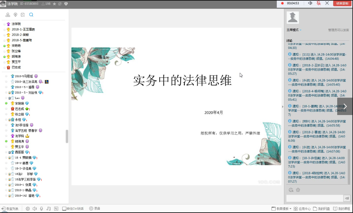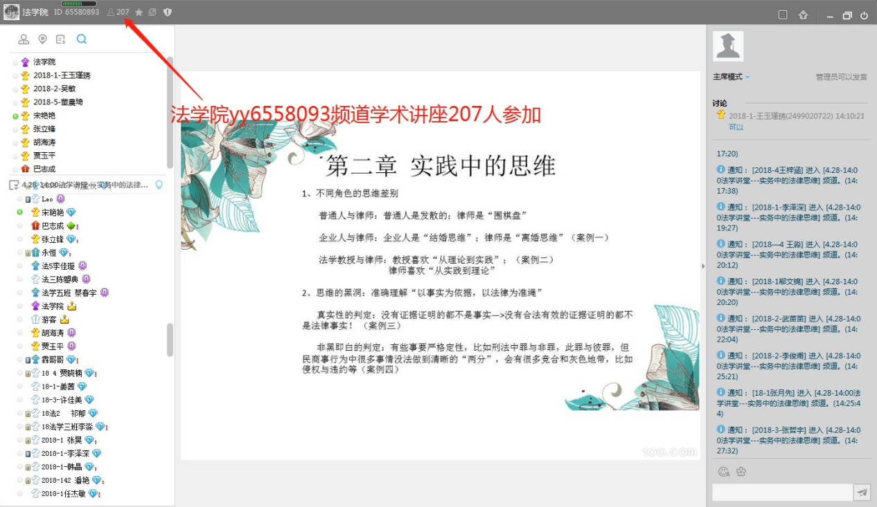4月28日下午,beat365在线唯一官网邀请优秀校友96级国际经济法本科班的宋艳艳律师,在学院yy65580893频道举办了一场题为“实务中的法律思维”教学沙龙活动。