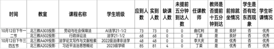 教学运行总体情况良好。检查组安排8名工作人员分别到各个教室,对10月12日下午的上课情况进行了全面检查,共检查4个教学班。教师们整体课程思路清晰,课程的重难点突出,设计合理。各个班级的学生们听课较为认真,及时记录课堂笔记,主动思考并回答问题,没有出现学生在教室吃东西的现象,学生听课状态优秀。