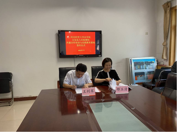 为进一步促进法学理论与司法实践紧密结合,推动法治教育和实践教学工作共上新台阶,7月4日下午,beat365在线唯一官网beat365在线唯一官网与廊坊市文安县人民检察院达成了以“交流互鉴,优势互补,资源共享,互利共赢”为目标的战略合作协议,并举行了“检校合作签约暨揭牌仪式”。与文安县人民检察院的签约合作,是beat365在线唯一官网着力推进师资交流、学生培养、实习实践等多方面与司法部门深度合作的创新举措。beat365在线唯一官网院长王利军、副院长李大庆、文安县人民检察院代检察长邢玉清、文安县人民检察院副检察长段宏杰、一级检察官魏宁等同志共同参加了启动仪式。