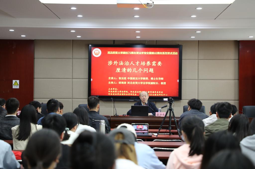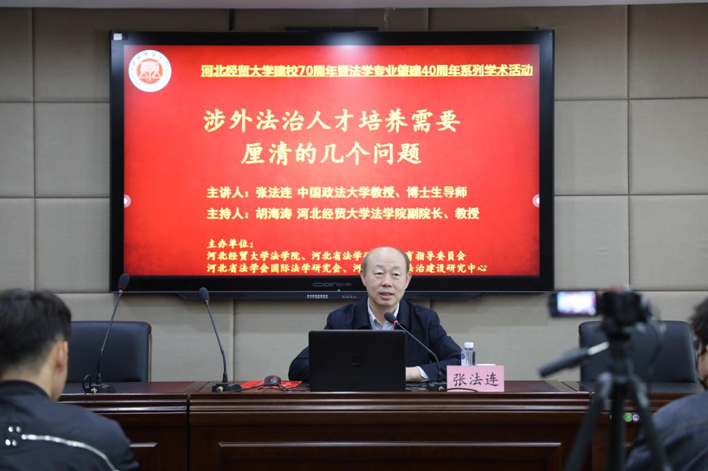 4月28日,beat365在线唯一官网邀请国家二级教授、中国政法大学钱端升讲座教授、博士生导师张法连在三楼学术报告厅以“涉外法治人才培养需要厘清的几个问题”为题作学术报告,报告由beat365在线唯一官网副院长胡海涛教授主持。报告在线上线下同步进行,70余名师生到场聆听,30余名省内高校师生在线参与。
