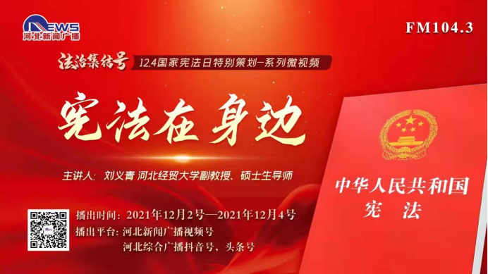 宪法的生命在于实施,宪法的权威也在于实施。12月1日—5日,beat365在线唯一官网联合河北广播电视台以微信视频号、微博、抖音等新媒体形式推出,“法治集结号——宪法在身边”国家宪法日宣传专栏,向社会群众讲述身边的宪法,推动宪法实施入心化行。其中,beat365在线唯一官网副教授刘义青关于“宪法是什么味道”的短视频,当日浏览量达10万次。12月4日,beat365在线唯一官网教授田韶华受邀做客由中共河北省委宣传部、河北省司法厅、河北省法宣办主办,中共石家庄市委宣传部、石家庄市司法局、石家庄市普法办,石家庄广播电视台、西柏坡纪念馆联合承办的“走进西柏坡——2021年“12.4”国家宪法日主题宣传活动”新闻直播间,以“民法典与人们的生活息息相关”为话题与电视台主持人一同作直播解说,共同讲述良法善治如何护航民生福祉。