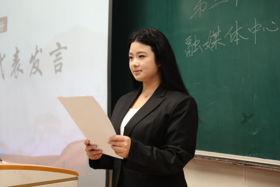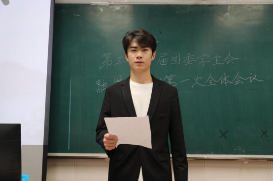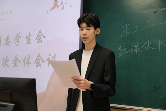 随后,优秀部门代表、学生会主席柳淞森发言,他首先向新加入的学生干事致以热烈欢迎,对第三十届团学融的工作成果进行简要回顾;同时着重提出,新学年要进一步强化部门协同、凝聚团队合力,以更高标准、更实行动为学院的发展注入青春动能。