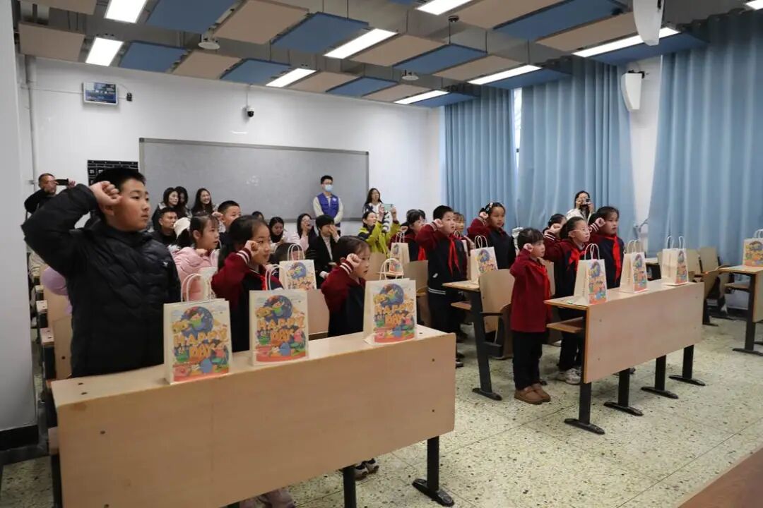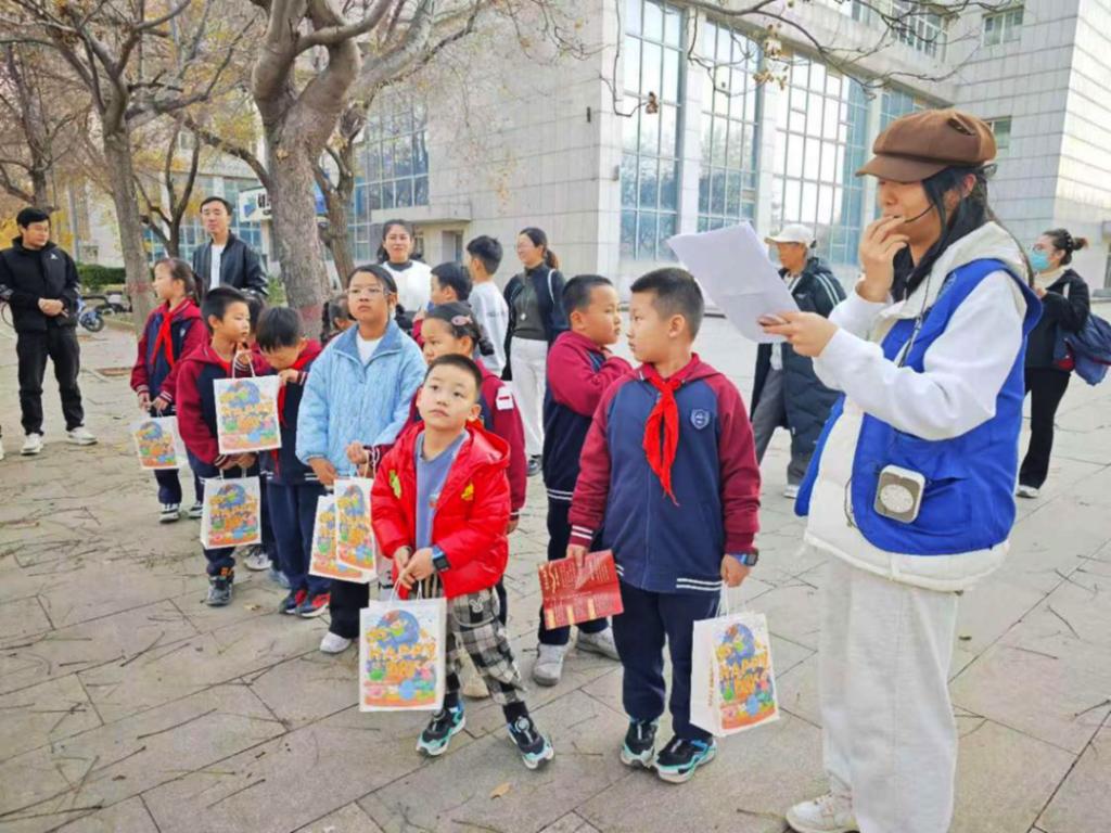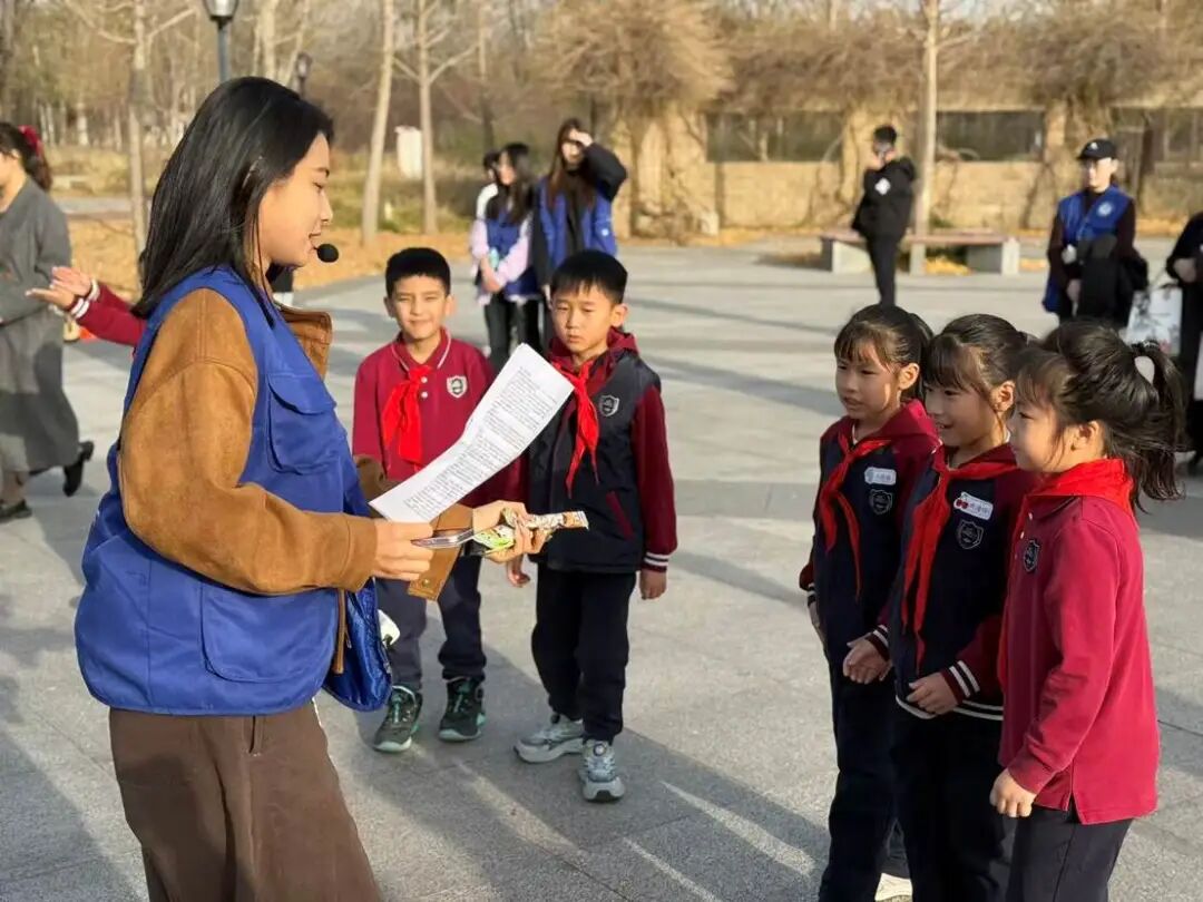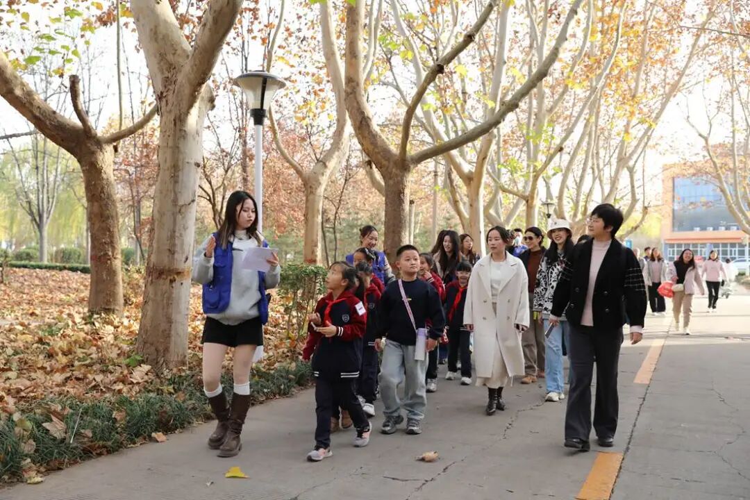 校园初体验环节涵盖三大特色场所:志愿者引领孩子们漫步金黄银杏林,宣讲员结合校园年轮故事与特色银杏节,讲述学校的发展历程;行至荷花池畔,“海阔凭鱼跃”的石碑前,志愿者向孩子们传递“志存高远、逐梦前行”的美好期许;走进图书馆,浓郁的墨香与丰富的藏书让孩子们直观感受大学的求知氛围与学术底蕴。在校园后花园,“报团打天下”趣味游戏欢乐开启,随着志愿者喊出数字口令,孩子们笑着奔跑、快速组队,在轻松愉悦的互动中拉近彼此距离,锤炼团队协作意识,为整场活动增添了满满的童趣与活力。