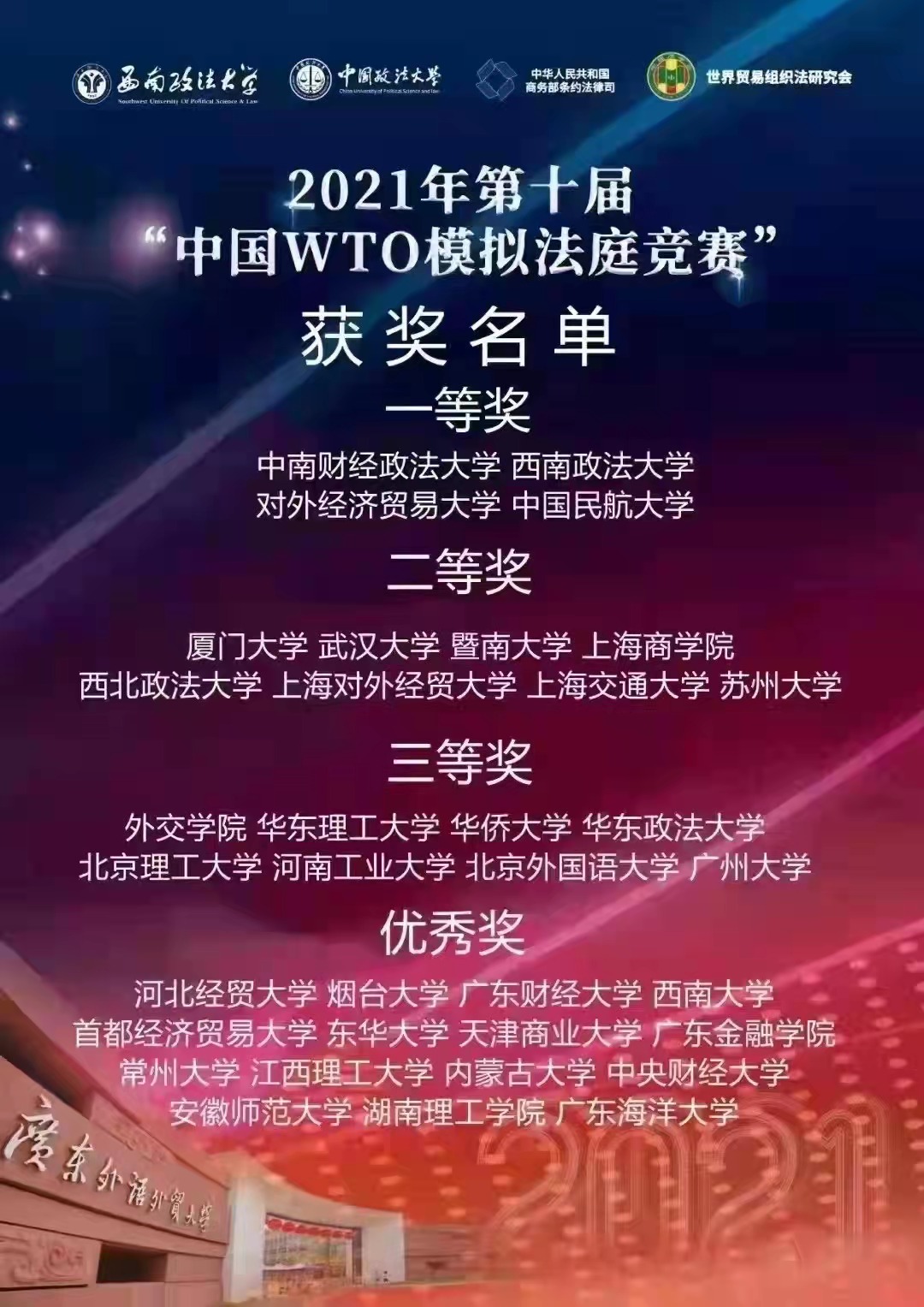 2021年12月19日,第十届“中国WTO模拟法庭竞赛”落下帷幕。本次模拟法庭竞赛采用线上庭审的方式进行。该项赛事由西南政法大学、中国政法大学、中国法学会世界贸易组织法研究会和中华人民共和国商务部条法司共同主办,由广东外语外贸大学、西南政法大学和中国法学会世界贸易组织法研究会联合承办。来自beat365官网和中南财经政法大学、西南政法大学和武汉大学等高校39支代表队参赛。