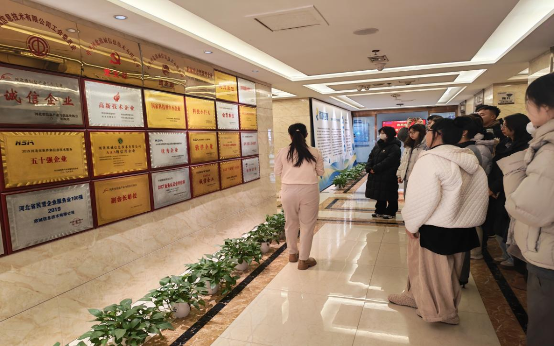 工作人员为经贸师生们播放了企业宣传视频。欣诚信息技术有限公司成立于2002年,在河北省11个地市成立了分公司或办事处,建立了遍布全省的软件研发、项目实施、系统运维、统一规范化流程的一站式服务体系。为公、检、法、司、军队、教育、金融、医疗等行业客户提供优质、高效、专业的定制化服务。是一家专注于信息系统集成、软件开发和大数据治理的高新技术企业。