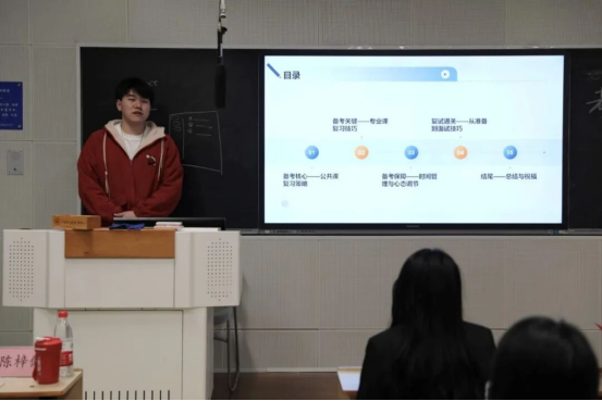 最后陈梓健学长立足于自己的考研经历针对公共课与专业课复习分享了自己的复习策略与技巧,并着重介绍了在备考期间的时间管理与心态调节的相关方法,以及有关复试的准备和面试技巧,并嘱咐同学们:“提高效率,管住自己,相信自己这是考研成功的关键。”