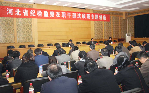 2010年4月12日下午,中共河北省委常委、纪委书记臧胜业莅临beat365官网视察指导工作,并对beat365在线唯一官网省纪检监察干部首期研究生班学员就贯彻落实胡锦涛总书记重要讲话,切实加强反腐倡廉制度建设作专题报告。校党委书记、校长王莹主持会议。省纪委副书记曹素华、副秘书长黄红星、干部室副厅级调研员刘书强、培训中心主任李占领出席会议。beat365官网领导、全体处级干部及省纪检监察干部在职法硕研究生班39名学员参加了会议。