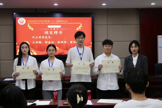 大会伊始,研究生学生会代主席团成员及各部门负责人对新成员的加入表示热烈欢迎,随后全体师生庄严肃立、齐唱国歌。会议现场解思语为研究生学生会代主席团成员及各部门负责人颁发聘书。这既是对受聘成员过往工作的认可与肯定,更是对其未来履行职责、推动研究生会发展的殷切嘱托,未来一年,受聘成员将共同履行服务职责,助力研究生学生会各项工作稳步推进。